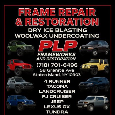 At PLP Frameworks and Restoration, we are dedicated to providing high-quality automotive frame repair and restoration to our customers. Our experienced team of technicians are experts in all aspects of frame care and repair. You may have a truck or SUV that some deem unfixable and a complete loss that will be donated to a scrap yard even though it runs great and looks great, that is why we are here, we may be able to save it and get you back on the road for a few more years until you are ready to buy a new vehicle , frame repairs and undercarriage restorations for Jeep, Toyota, Chevy, GMC, Ford trucks are a daily job for us so call us for a free consultation.